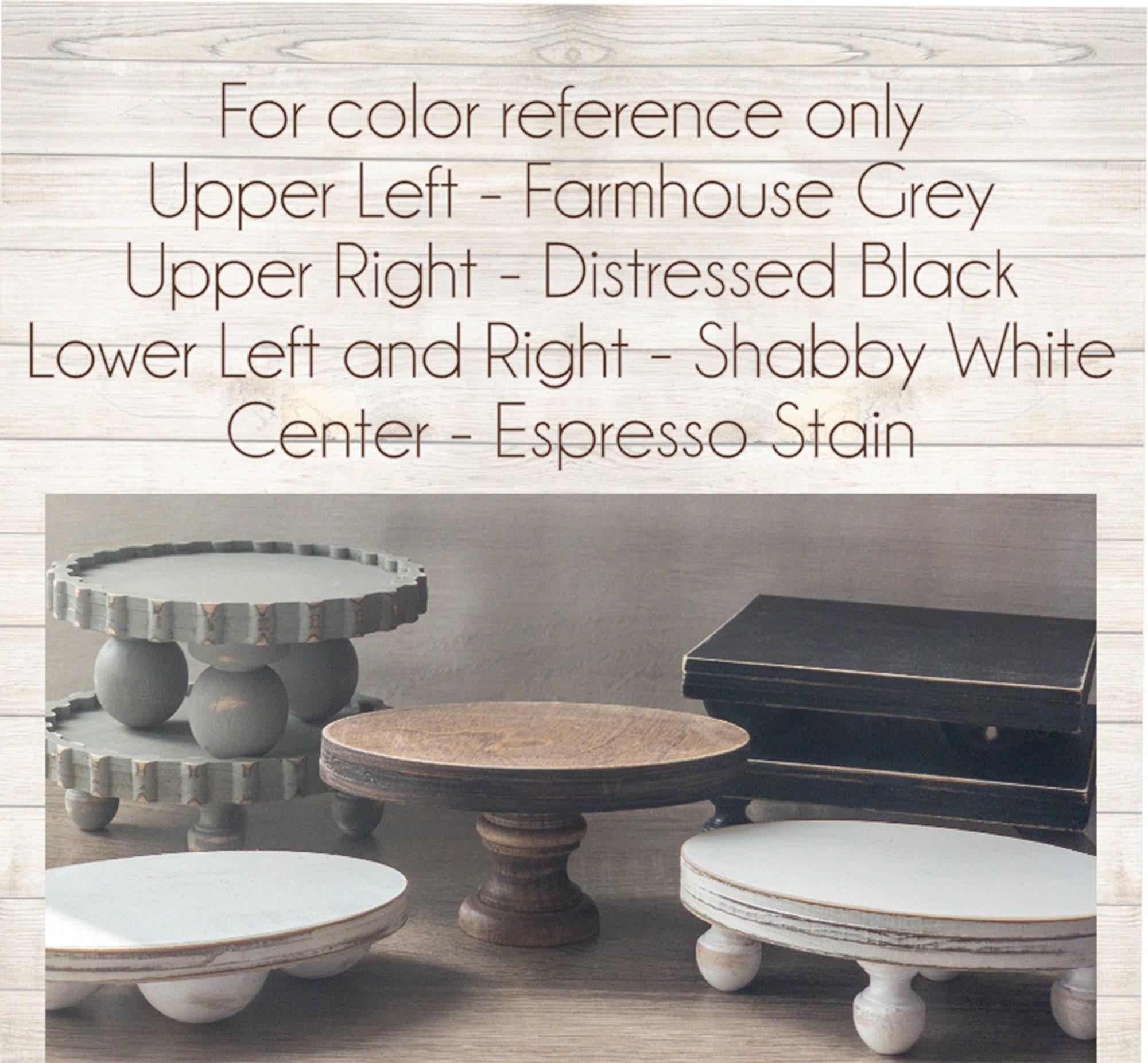 Choose from 4 different color options — Farmhouse Grey, Shabby White, Distressed Black or Espresso Stain. Please note that the natural wood grain will be visible with the stain.