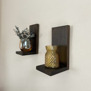 Small wood wall hanging with shelf for plants or decor. Sawtooth hanger on the back (screws/nails not included). Pictured in Early American stain (photos 1-3) and Jacobean stain (video and photos 4-6).