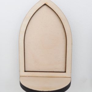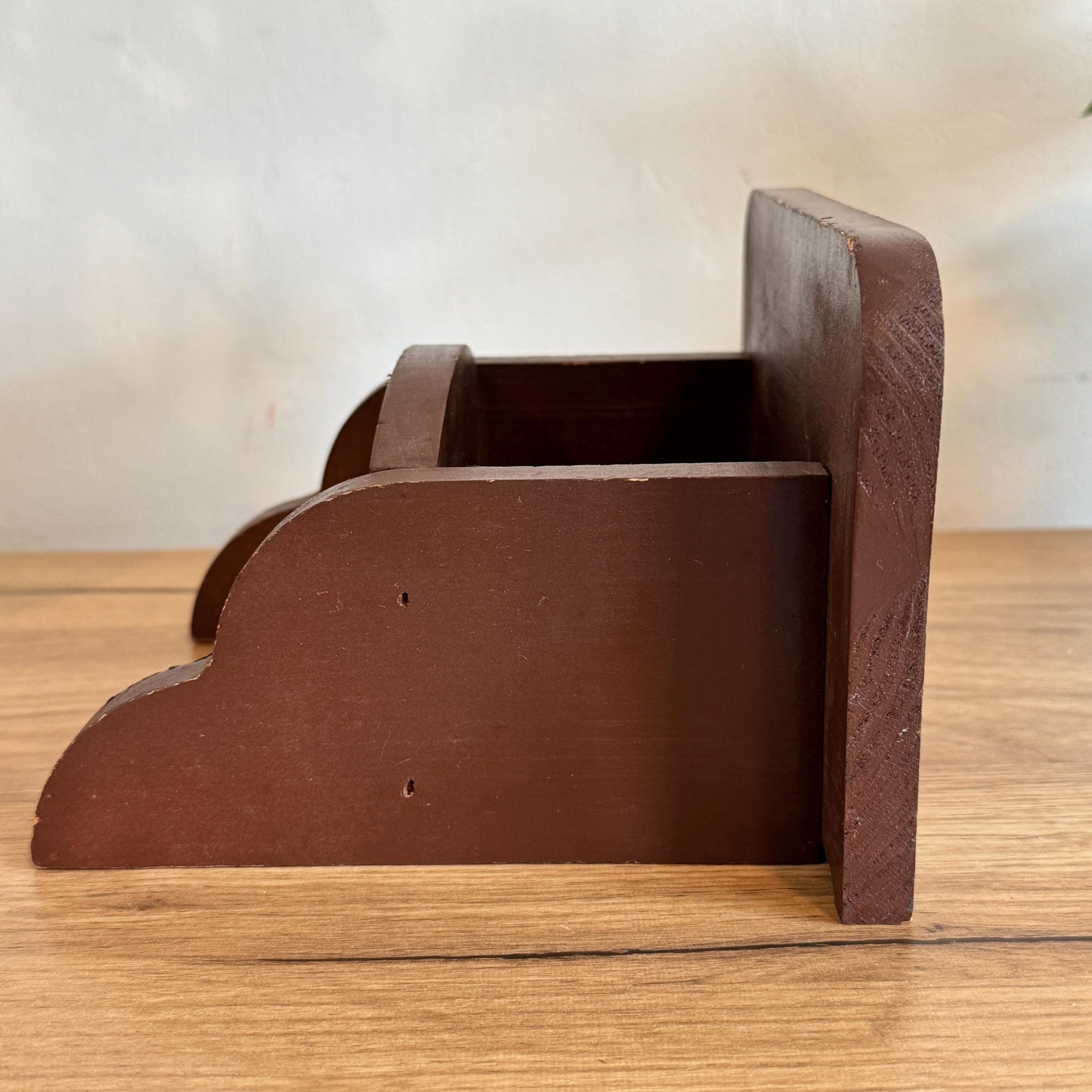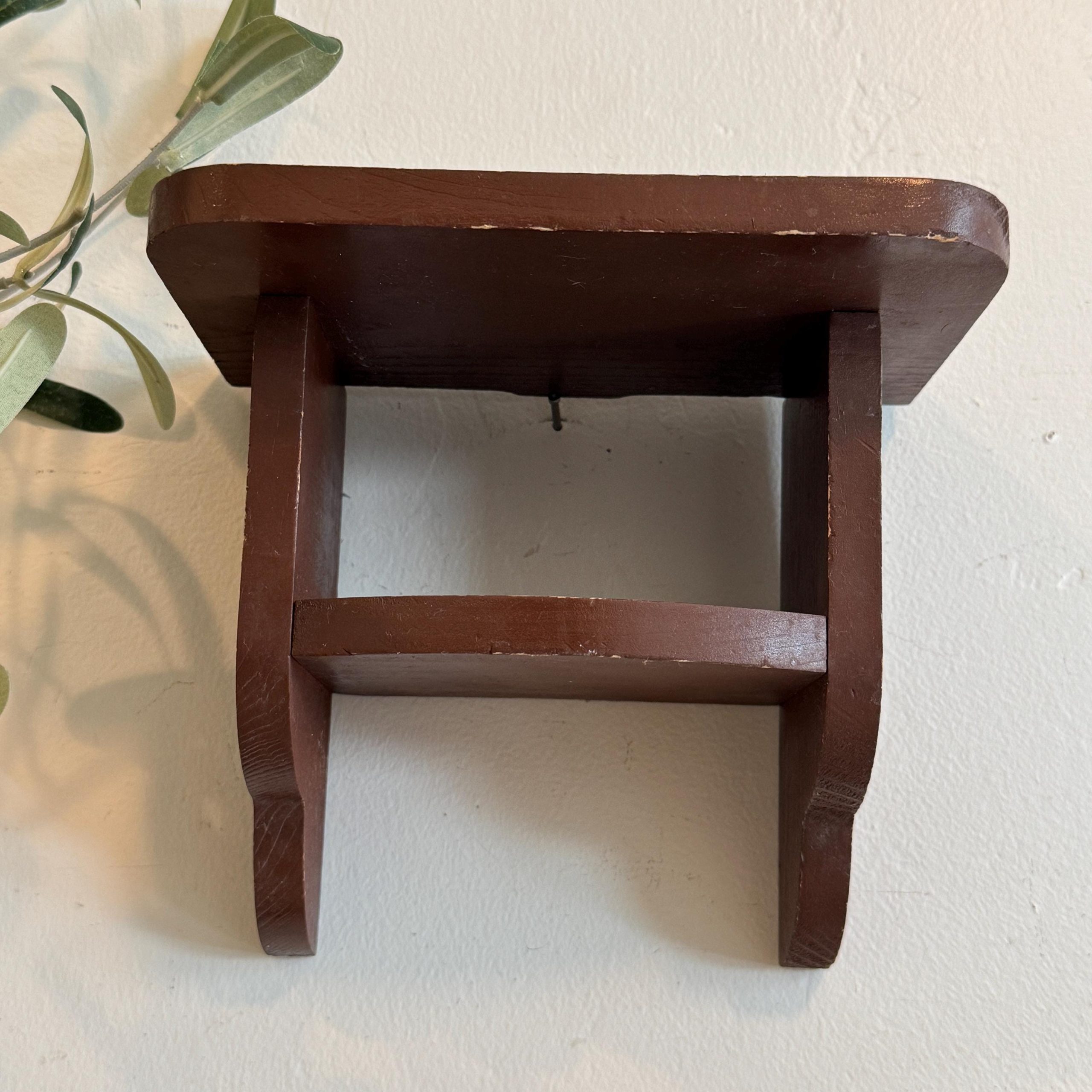 Vintage wood shelf with hand cut bracket details and aged patina, solid wooden wall mounted display shelf.